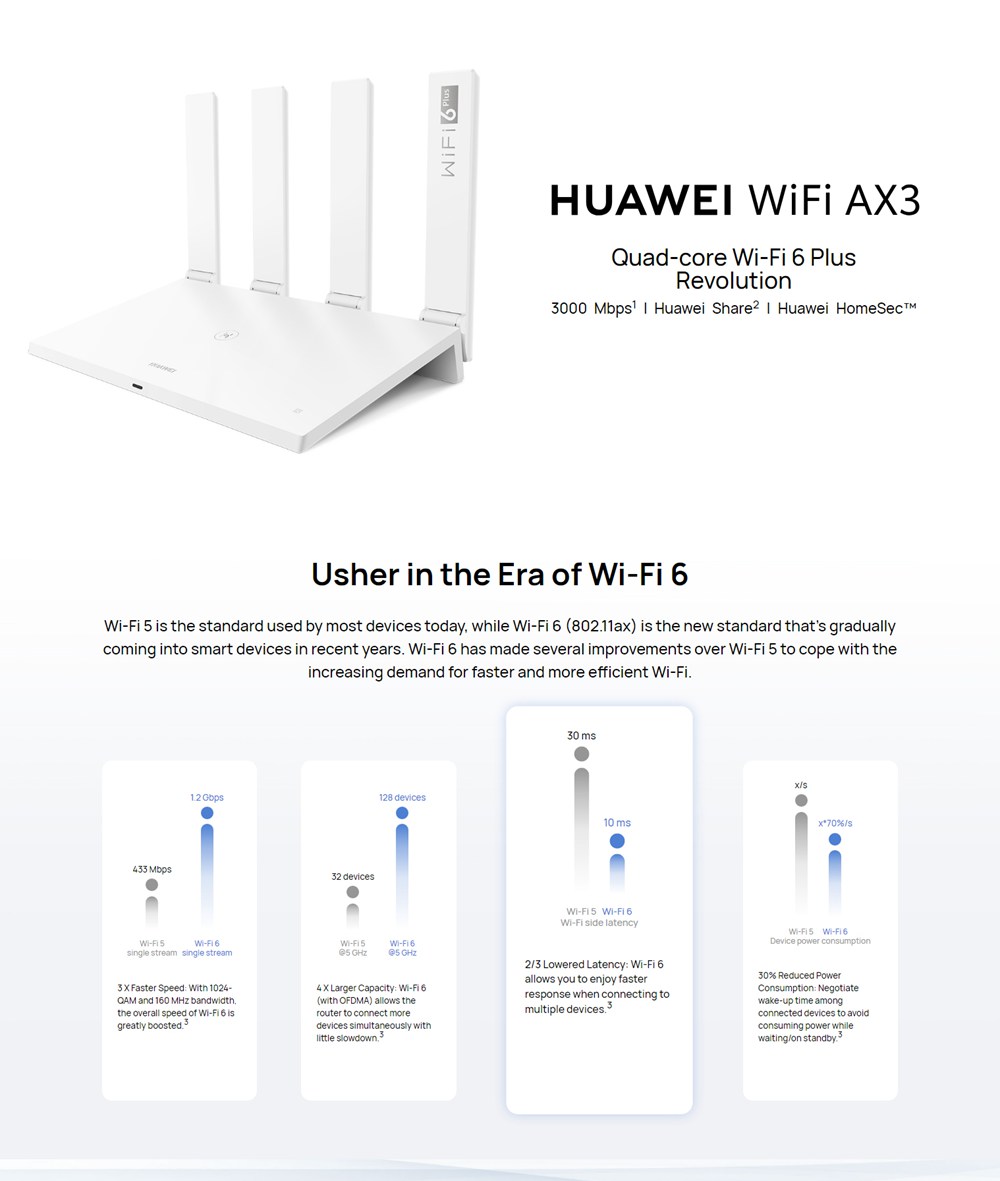 As AX3 supports 160 MHz, when connecting AX3 to devices supporting 160 MHz, like top-of-the-line HUAWEI Wi-Fi 5-enabled smartphones, tablets and laptops, the internet speed would increase 60% and more. This offers you an unprecedented, lag-free experience on mobile devices.
